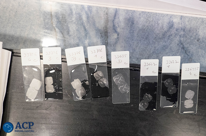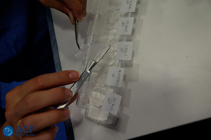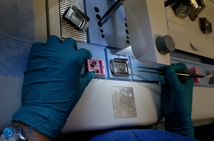 Chaque cassette est ouverte. Son contenu est repositionné dans un moule en métal, puis figé dans un bloc de paraffine par contact avec une platine réfrigérée.