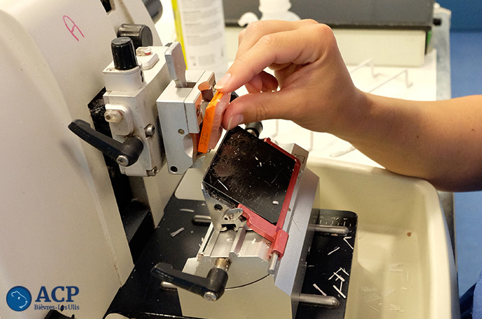 Chacun des blocs va être placé dans un portoir sur un microtome, qui est un instrument servant à confectionner des coupes très fines (quelques centièmes de millimètres).