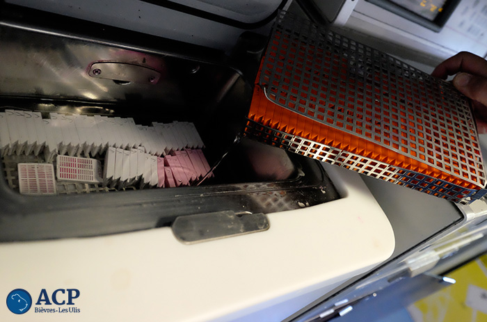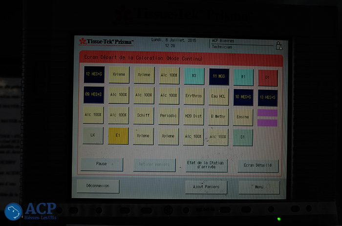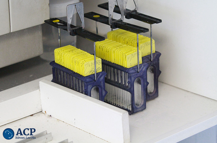 Après séchage, les lames sont disposées dans des portoirs métalliques et sont placées dans un automate de coloration.