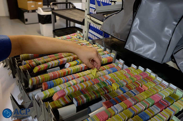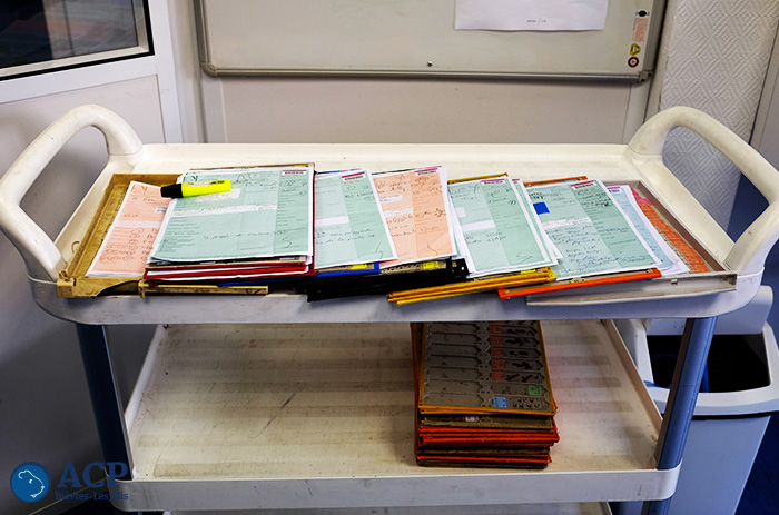 Les lames colorées sont agencées sur des plateaux, accompagnées des bons de demande d’examen. Les plateaux de lames sont ensuite livrés dans les bureaux des médecins.
