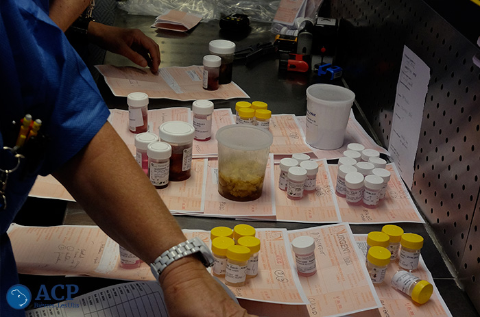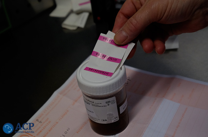 À la réception des prélèvements, les techniciens, en binôme, vérifient la concordance entre les bons de demande d’examen ACP et les flacons. Ils étiquettent les bons et les flacons.