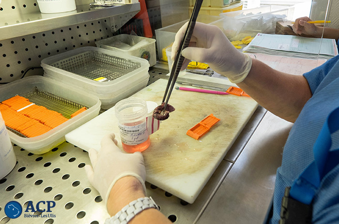 En macroscopie, chaque flacon est ouvert. Son contenu est décrit. Les petits prélèvements sont prélevés en totalité. Pour les pièces opératoires, des zones particulières sont sélectionnées.