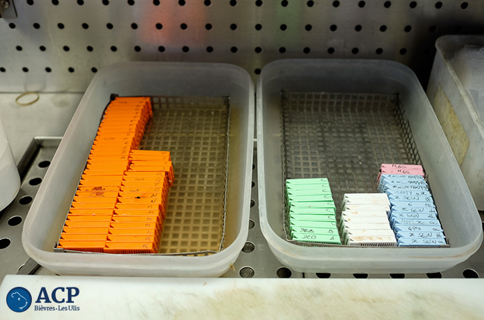 Les échantillons sont ensuite placés dans des petites cassettes en plastique ajouré qui sont étiquetées et numérotées, puis immergées dans les bacs de formol.